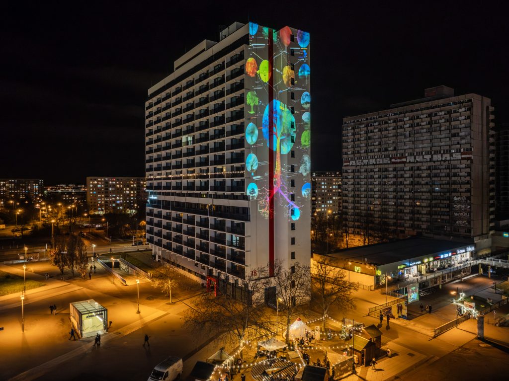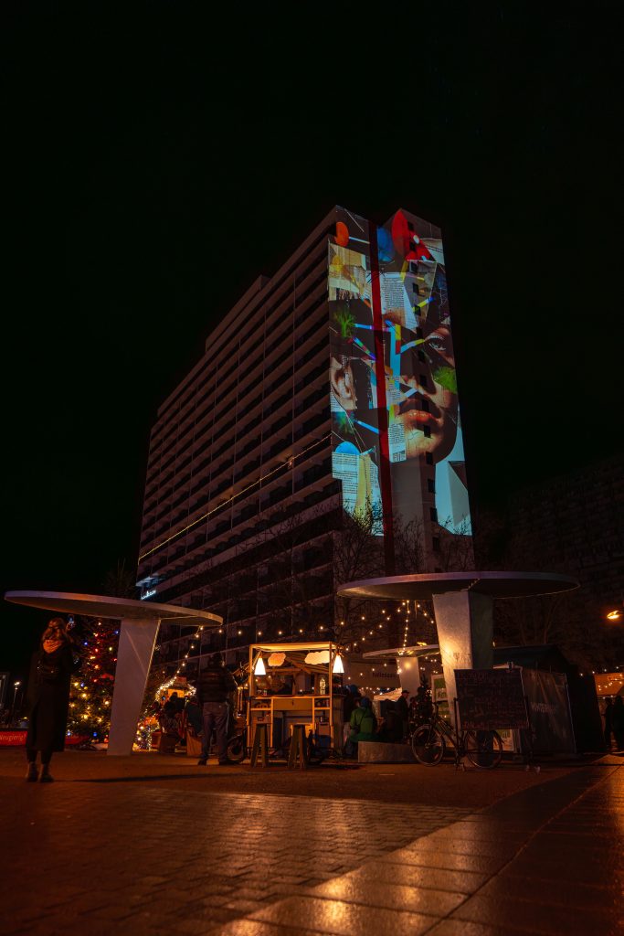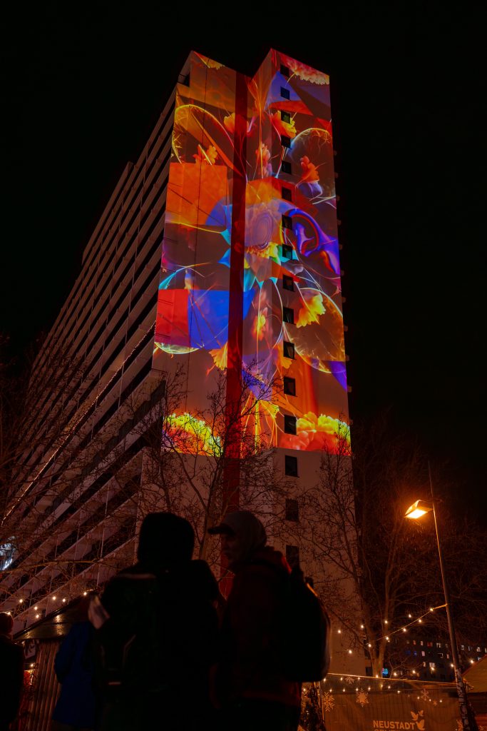 Als Highlight inszenierte der Künstler Mahir Duman die Hochhausscheibe A mit einer großen Videoprojektion. Die Projektion setzte die Scheibe komplett neu in Szene und beeindruckte Besucher:innen wie Passant:innen. Wir danken Allen, die mit ihren Ideen, Fotos und Projektionen die Neustädter Passage zum Leuchten gebracht haben!